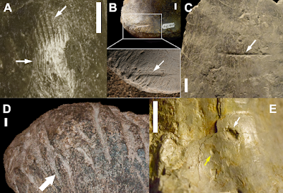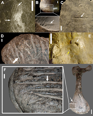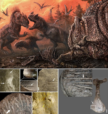 [Paleontology • 2020] High Frequencies of Theropod Bite Marks provide Evidence for Feeding, Scavenging, and possible Cannibalism in A Stressed Late Jurassic Ecosystem  | Dry season at the Mygatt-Moore Quarry showing Ceratosaurus and Allosaurus fighting over the desiccated carcass of another theropod. Types of bite marks observed in the MMQ assemblage with arrows indicating features of note.