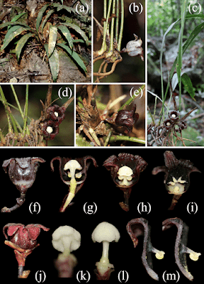 | Figure 1. Aspidistra corniculata Vislobokov. A) whole plant in its natural habitat; b) flower with whitish perigone arising from the rhizome; c) flowering plant; d) rhizome with reddish purple flowers from the top down; e) rhizome with reddish purple flower from lateral view; f) particular of the flower, lateral view); g) flower, longitudinal section; h) flower, inner part; i) flower, inner part without gynoecium; j) flower, lateral view; k) gynoecium, from below; l) gynoecium, lateral view; m) perigone with stamen.