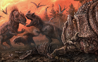 | Fig 4. Dry season at the Mygatt-Moore Quarry showing Ceratosaurus and Allosaurus fighting over the desiccated carcass of another theropod.