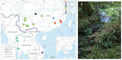 Figure 1. Collection localities of samples used in this study and habitat of Brachytarsophrys orientalis sp. nov. A: Localities of Brachytarsophrys orientalis sp. nov.: 1: Huboliao Nature Reserve, Fujian; 2: Shanghang County, Fujian; 3: Jiulianshan Nature Reserve, Jiangxi. Localities of B. popei; 4: Taoyuandong Nature Reserve, Hunan. Localities of B. chuannanensis; 5: Hejiang County, Sichuan. Localities of B. platyparietus; 6: Mt. Fanjing, Guizhou; 7: Mt. Jinzhong, Guangxi; 8: Shiping County, Yunnan; 9: Mt. Mopan, Yunnan; 10: Dayao County, Yunnan; 11: Yanbian County, Yunnan. Localities of B. feae; 12: Jingdong County, Yunnan. Localities of B. carinense; 13: Mae Surin NP., Mae Hong Son, Thailand; 14: Omkoi, Chiang Mai, Thailand; 15: Thong Pha Phum, Kanchanaburi, Thailand. Localities of B. intermedia; 16: Krong Pa, Gia Lai, Vietnam. B: Habitat of Brachytarsophrys orientalis sp. nov. in Jiulianshan Nature Reserve, Jiangxi Province. |