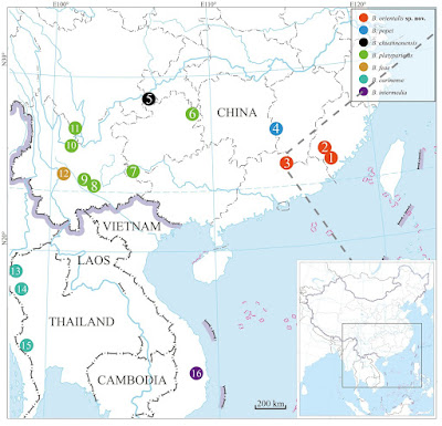 Figure 1. Collection localities of samples used in this study. Localities of Brachytarsophrys orientalis sp. nov.: 1: Huboliao Nature Reserve, Fujian; 2: Shanghang County, Fujian; 3: Jiulianshan Nature Reserve, Jiangxi. Localities of B. popei; 4: Taoyuandong Nature Reserve, Hunan. Localities of B. chuannanensis; 5: Hejiang County, Sichuan. Localities of B. platyparietus; 6: Mt. Fanjing, Guizhou; 7: Mt. Jinzhong, Guangxi; 8: Shiping County, Yunnan; 9: Mt. Mopan, Yunnan; 10: Dayao County, Yunnan; 11: Yanbian County, Yunnan. Localities of B. feae; 12: Jingdong County, Yunnan. Localities of B. carinense; 13: Mae Surin NP., Mae Hong Son, Thailand; 14: Omkoi, Chiang Mai, Thailand; 15: Thong Pha Phum, Kanchanaburi, Thailand. Localities of B. intermedia; 16: Krong Pa, Gia Lai, Vietnam. |