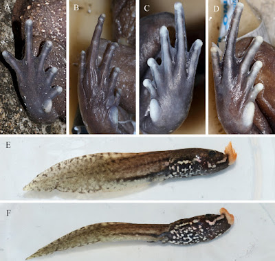 Distribution and habitats: This species is currently recognized from northern Myanmar and Yunnan Province in southwestern China at 650 to 2 100 m a.s.l.. Specimens are found in montane streams, under rocks or deep burrows surrounded by moist evergreen broadleaf forests. Male individuals begin to emit a series of croaks in April. The spawning season is from May to June (Fei & Ye, 2009; this study).