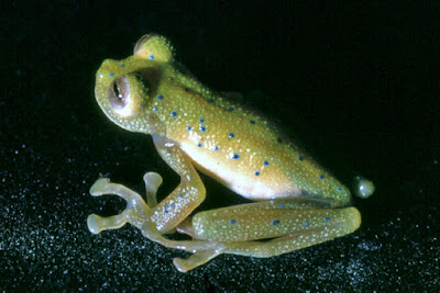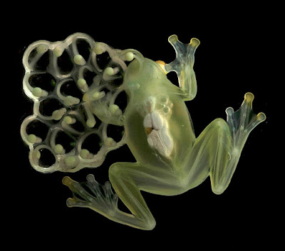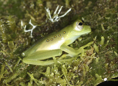 | Figure 5. Parental care in glassfrogs. Adult male of Hyalinobatrachium aureoguttatum, with egg clutch. Photo by Luis A. Coloma. |