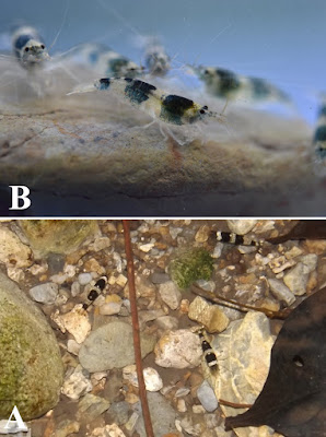 | Fig. 4. Caridina tricincta, new species. A, in situ photograph (by Nguyen Anh Tuan) at a stream of Khau Tinh Commune, Na Hang District, Tuyen Quang Province; B, live individuals collected in Lac Nong Commune, Bac Me District, Ha Giang Province. |