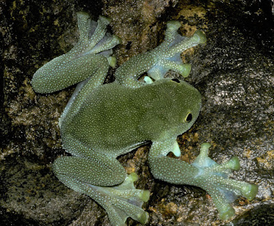 Common names: English: Large-handed Glassfrog. Spanish: Rana de Cristal de manos grandes.