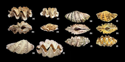 | Figure 6: Shells of endemic WIO Tridacna species. (a‐d) Tridacna rosewateri Sirenko & Scarlato, 1991, Saya de Malha Bank, including a‐b. Paratype ZISP N10569, L 191 mm and c‐d. Holotype ZISP N10568, L 149 mm. (e,f) Tridacna lorenzi K. Monsecour, 2016, Mauritius, Cargados Carajos Shoals, St. Brandon, holotype MNHN‐IM‐2000–30800, L 225 mm. (g‐l) Tridacna elongatissima Bianconi, 1856. (g‐i) Mozambique, lectotype MZB 009876, L 198 mm (photo: Antonio Bonfitto). (j‐l) South Madagascar, Atimo Vatae stn TF20, MNHN‐IM‐2009–33486, L 175 mm |