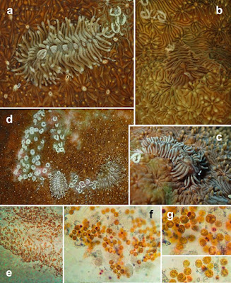| Fig. 1 Phestilla viei Mehrotra, Caballer & Chavanich sp. nov. on Pavona explanulata. a Living specimen (28 mm long) in dorso-lateral view with low symbiont density; b Specimen (23 mm long) camouflaged among the coral; c Living specimen (17 mm long) in lateral view; d Two specimens with low symbiont density with their egg masses. Durusdinium sp. associated to Phestilla viei sp. nov; e General view of a section of a single ceras; f Durusdinium sp. in the ceras matrix; g Details of the symbiont cells |