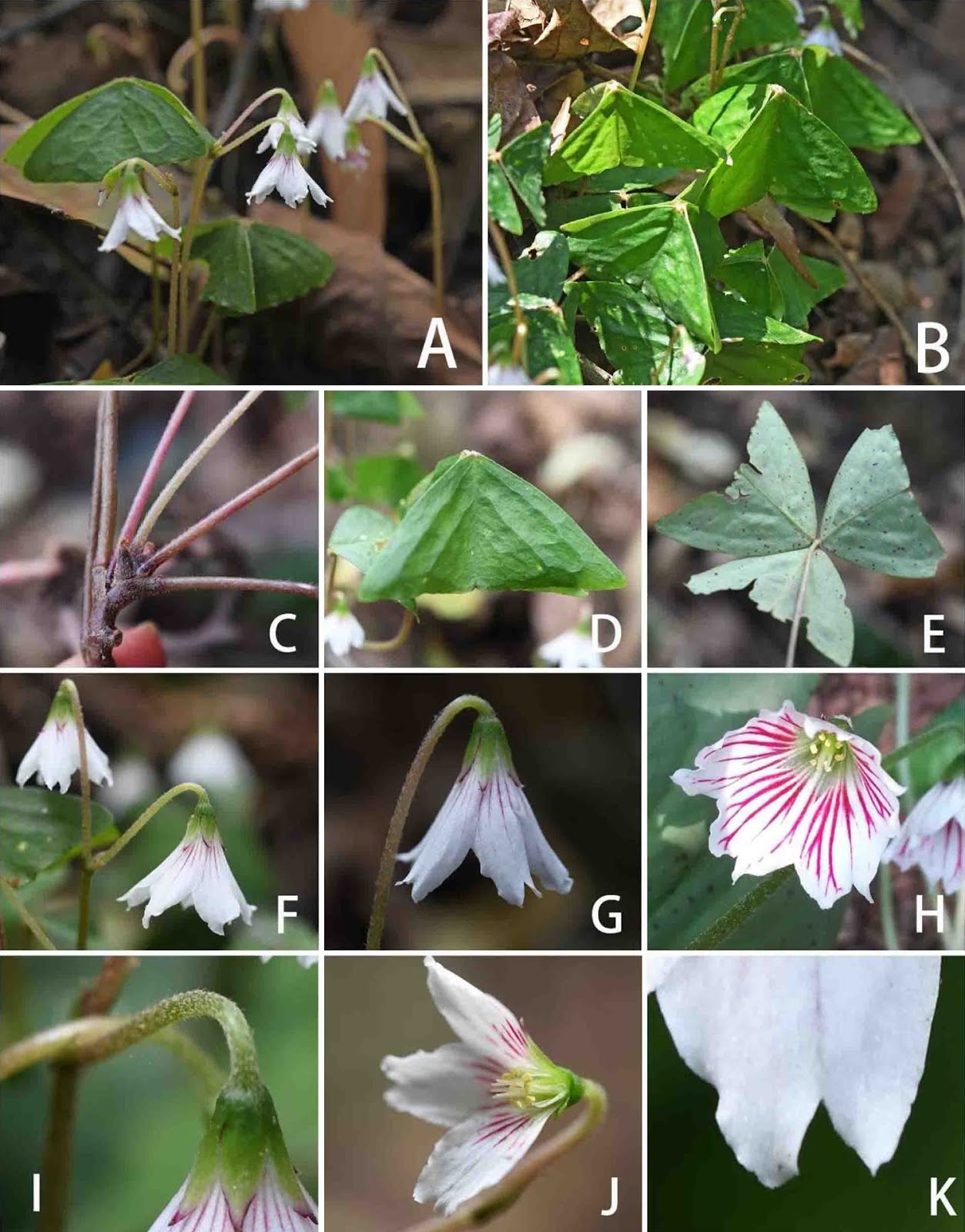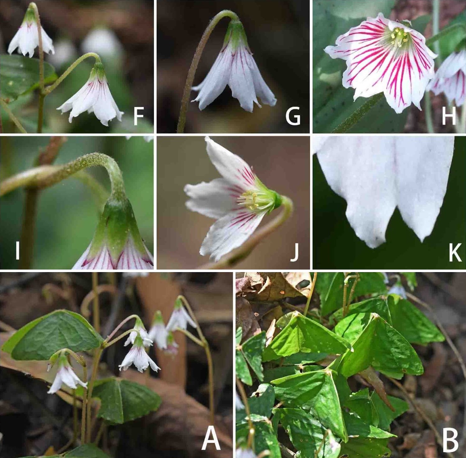 | Fig. 1. Oxalis shibeishanensis sp. nov. A, B. Habit, C. Top part of rhizome with petioles, D. Adaxial surface of leaflet, E. Abaxial surface of leaflets, F. Upper portion of inflorescence, G. Flower with pedicel, H. Flower at front view, I. Pedicel and sepals, J. Lateral view of flower with two petals and two sepals removed, K. Petal apex. | Oxalis shibeishanensis Huan C. Wang & Y. Tian, sp. nov. 石碑山酢漿草 Type: CHINA. Yunnan Province, Shuangbai County, Anlongbao village, Shibeishan Mountain, ..., 24 March 2019, H. C. Wang, F. Yang, Q.P. Wang & Y. R. Li SB5788 (holotype: YUKU [02070800]!, isotypes: YUKU [02070801, 02070802, 02070803]!) Diagnosis: Oxalis shibeishanensis is most similar to O. obtriangulata, but clearly differs from the latter by its 1.5–3 cm long, 3–9 cm wide leaflets with broadly cuneate base and not emarginate apex, 2-flowered inflorescences, narrowly ovate to broadly lanceolate sepals, and petals being bifid at the apex. Distribution and habitat: Oxalis shibeishanensis is known only from two very close localities in Shibeishan Mountain of Shuangbai County, in central Yunnan Province, Southwest China. It usually grows on the moist and shady places near streams or swamps, at altitudes of 1950–2100 m. Etymology: The specific epithet refers to the type locality, the Shibeishan Mountain of Shuangbai County, Southwest China. Ye Tian, Feng Yang, Xiao-Lan Liu and Huan-Chong Wang. 2020. Oxalis shibeishanensis (Oxalidaceae), A New Species from Yunnan, Southwest China. Taiwania. 65(3); 360-363. taiwania.ntu.edu.tw/abstract.php?type=abstract&id=1695