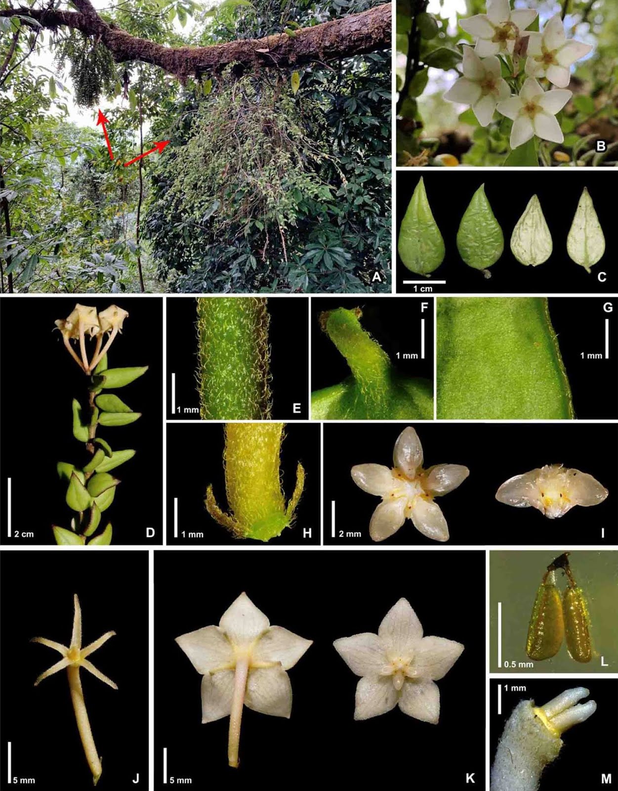 | Fig. 3. Hoya longicalyx. A. Habits of the new species in situ, arrows indicate the plants. B. Inflorescence. C. Leaves. D. Branch and inflorescence. E. Leafy stem. F. Petiole. G. Lamina margin. H. Bracteoles. I. Corona (top view and side view). J. Calyx. K. Corolla (adaxial and abaxial sides). L. Pollinarium. M. Pistils. Photographed by H. Wang and E. F. Huang. |