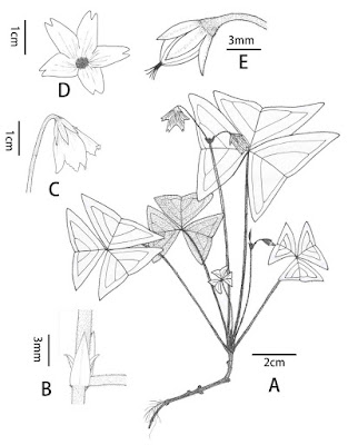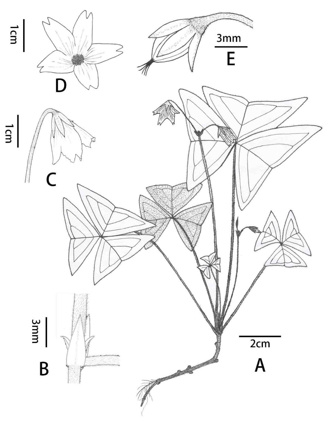 in Tian, Yang, Liu & Wang, 2020. | AbstractOxalis shibeishanensis Huan C. Wang & Y. Tian (Oxalidaceae), belonging to O. subsect. Oxalis, is described and illustrated as a new species endemic to Yunnan, Southwest China. It is most similar to O. obtriangulata, but clearly differs from the latter by its 1.5–3 cm long, 3–9 cm wide leaflets with broadly cuneate base and not emarginate apex, 2-flowered inflorescences, narrowly ovate to broadly lanceolate sepals, and the petals being bifid at the apex. Keyword: China, endemism, new species, Oxalidaceae, Oxalis, Oxalis obtriangulata | Fig. 2. Oxalis shibeishanensis sp. nov. A. Habit, B. Portion of inflorescence showing bracts, C. Flower with pedicel, D. Flower at front view, E. Young fruit. |