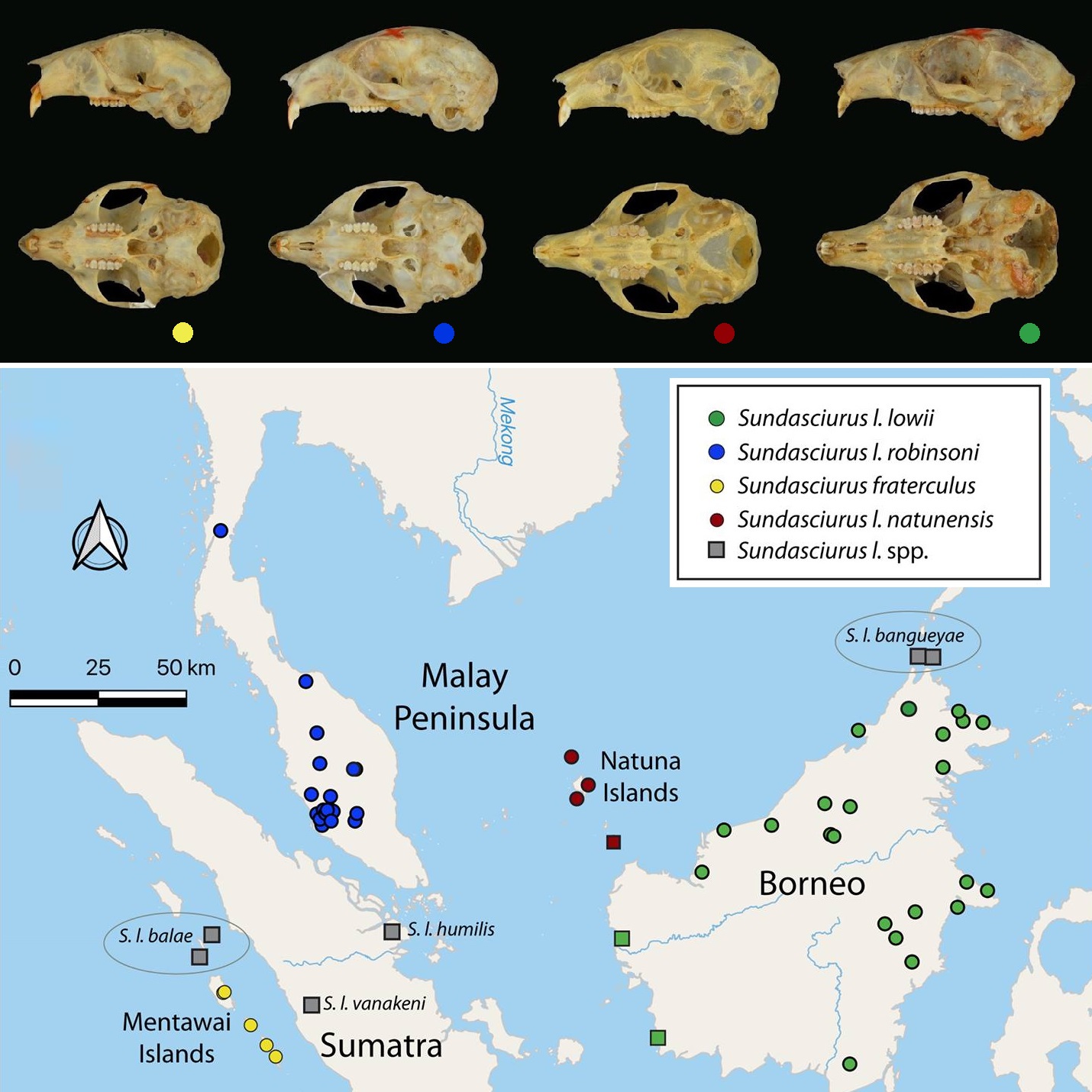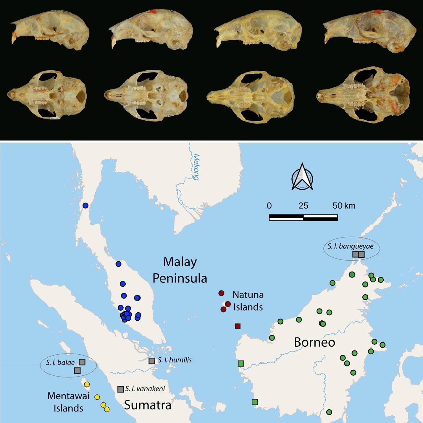 Distribution: Southern Natuna islands (only recorded in Sirhassen Island), and possibly in west Borneo. Despite discrete characters such as postorbital processes and tail shape of the latter populations closely resemble S. natunensis, we currently consider the taxonomic status of west Borneo populations as incertae sedis given the intermediate phenotypic position of these among S. natunensis and S. lowii shown in the PCA and DAPC and the lack of genetic evidence. Genetic data from these, southern Sumatra and northern Natuna populations is needed to clarify the taxonomy and distribution of this group.