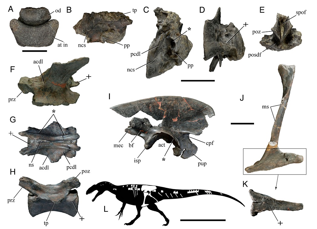 Abbreviations: acdl, anterior centrodiapophyseal lamina; act, acetabulum; at in, atlantal intercentrum; bf, brevis fossa; cpf, cupedicus fossa; isp, ischial peduncle; mec, medial crest; ms, medial symphysis; ncs, neurocentral suture; ns, neural spine; od, odontoid; pcdl, posterior centrodiapophyseal lamina; posdf, postzygapophyseal spinodiapophyseal fossa; poz, postzygapophysis; pp, parapophysis; prz, prezygapophysis; pup, pubic peduncle; spof, spinopostzygapophyseal fossa; tp, transverse process. Scale bars equal 25 mm (A), 50 mm (B–H), 100 mm (I–K), and 1 m (L). |