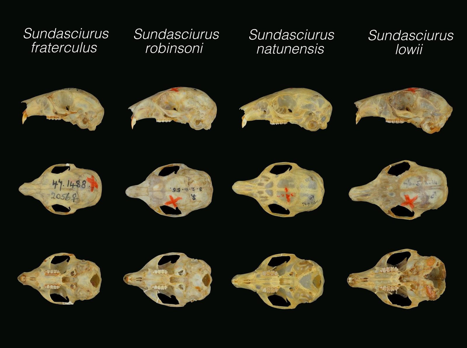 | Figure 6. Dorsal, palatal, and lateral views of the holotype skulls of Sundasciurus lowii (NHM76.5.2.14), Sundasciurus natunensis (NHM94.9.28.40) and Sundasciurus robinsoni (NHM3.2.6.55). Given the highly damaged state of the holotype skull of Sundasciurus fraterculus (NHM95.1.9.12), the type of Sundasciurus fraterculus siberu (NHM47.1488) is shown instead for the sake of comparison. All pictures are at the same scale. |