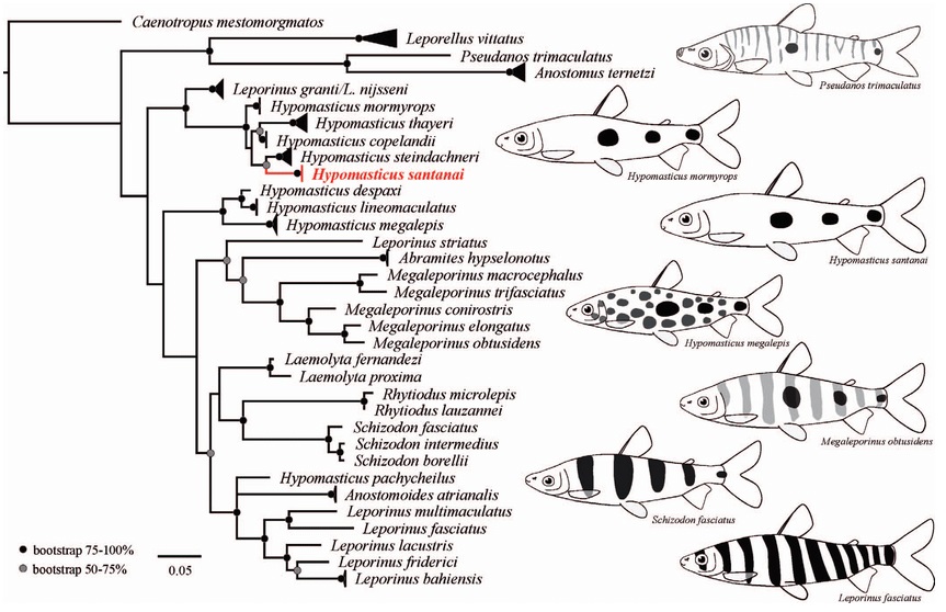 | Fig. 5. Maximum likelihood tree of Anostomidae showing the phylogenetic placement of Hypomasticus santanai. Bootstrap support is indicated by black (75-100%) and gray dots (50-75%); nodes with support lower than 50% have no dots. See Data Accessibility for tree file. |