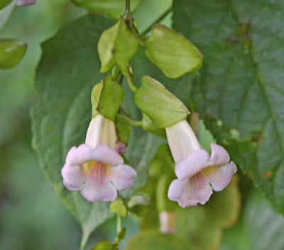 Recognition: Among Nepal species Thunbergia kasajuana is most similar to T. grandiflora in its inflorescence and calyx. In both T. grandiflora and T. kasajuana the calyx is annular and untoothed but T. grandflora is a woody climber and has much larger corolla lobes (2.5 – 4 cm long, not 0.5 – 0.8 cm long as in T. kasajuana). Moreover, T. grandiflora is a lowland species with pale blue or whitish flowers found below 1300 m while T. kasajuana has pink tinged flowers and is found at around 2000 m.
