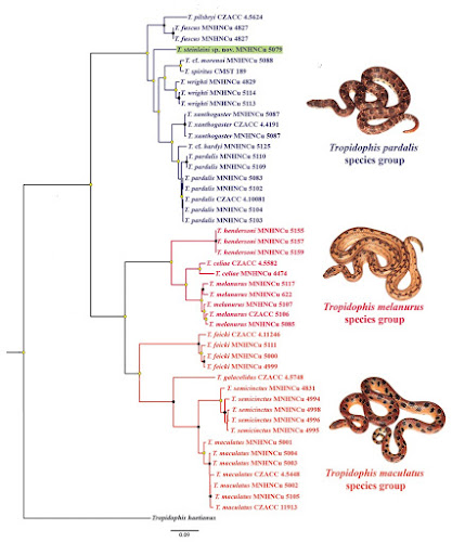 Luis M. Díaz and Antonio Cádiz. 2020. A New Species of Tropidophis (Squamata: Tropidophiidae) and Molecular Phylogeny of the Cuban Radiation of the Genus [ Una nueva especie de Tropidophis (Squamata: Tropidophiidae) y filogenia molecular de la radiación cubana del género] Novitates Caribaea. 16; 1-19. DOI: 10.33800/nc.vi16.222