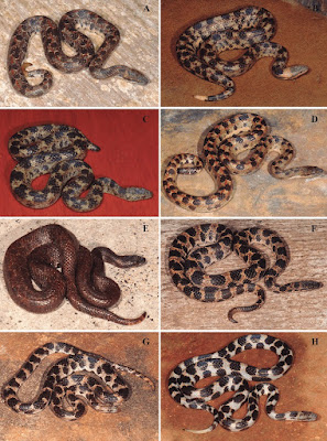 | Figure 6. Cuban snakes of the Tropidophis pardalis species group. A, T. pardalis, female, from Boyeros, La Habana Province; B, T. pardalis, female, from Soroa, Candelaria, Artemisa Province; C, T. xanthogaster, male, from La Bajada, Guanahacabibes, Pinar del Río Province; D, T. hardyi, male, from Río Jutía, Guajimico, Cienfuegos Province; E, T. fuscus, female, from Altiplanicie de El Toldo, Humboldt National Park, Holguín province; F, T. spiritus, female, from Alturas de Banao, Sancti Spiritus Province; G, T. cf. morenoi, male, from Jobo Rosado, Villa Clara Province; H, T. wrighti, from Altiplanicie de El Toldo, Humboldt National Park, Holguín Province. Photos: L. M. Díaz. |