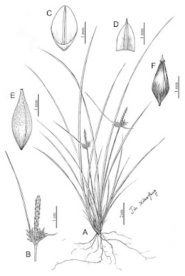| Fig. 1. Carex pingleensis: A. Habit, B. Inflorescence, C. Male glume, D. Female glume, E. Utricle, F. Nutlet. |