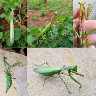 | Fig. 3. Titanodula attenboroughi gen. nov. et sp. nov., live photographs of holotype ♂ (A, B, C) and paratype ♀ [PT1] (D, E) at Kon Chu Rang N.R., VII. 2018. |