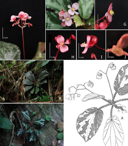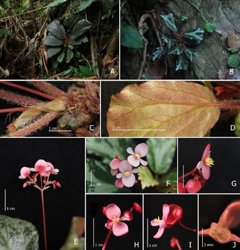| Begonia trucatifolia A. Habitat; B. Habitat of variegated variant; C. Stipules also showing petiole and rhizome; D. Leaf abaxial; E. Inflorescence and bracts; F. Staminate flowers face view; G. Staminate flower side view; H. Pistillate flower face view; I. Pistillate flower side view; J. Ovary cross-section. Photos A–B by D. Tandang, C–J by Y.P. Ang. |
