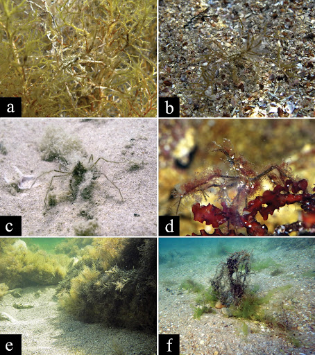 Ecology and epibiosis: In the Black Sea, the species was recorded between 0.5 and 9–12.8 m depth, but mostly within the upper 5–6 m on various substrates from rock and boulders to sand (Fig. 10e, f), in growing or detached aquatic vegetation, i.e. Ulva sp., filamentous green algae, Cystoseira sp., red algae (Fig. 10d). One male was also recorded in a community dominated by clams Chamelea gallina (Linnaeus, 1758), hermit crabs Diogenes pugilator (Roux, 1829) and predatory whelks Rapana venosa (Valenciennes, 1846) at about 10 m depth, where macrophyte vegetation is generally lacking, according to the underwater observations by the authors. It is very difficult to spot the crabs when they are hiding in algae (Fig. 10a). However, the males (but not females) were repeatedly observed walking on bare substrate, although a short distance from shelters and being decorated with pieces of algae (Fig. 10c). ...