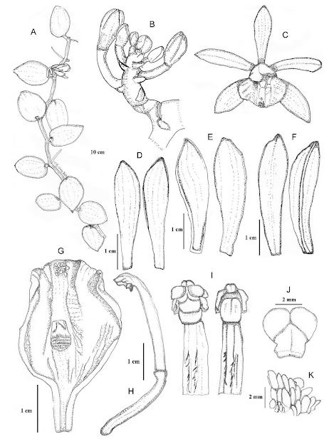 | Fig. 3. Vanilla tiendatii. A. Flowering plant; B. Infloresence; C. Flower, front view; D. Dorsal sepal; E. Lateral sepals; F. Petals; G. Lip; H. Column and pedicel; I. Column with anther cap (left) and without anther cap (right); J Anther cap; K. Papillate hairs.