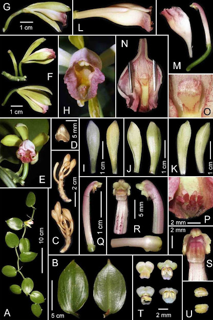 | Fig. 2. Vanilla tiendatii. A. Flowering plant; B. Leaf; C. Alcohol fixed inflorescences; D. Inflorescence bract; E. Flower, frontal view; F & G. Flowers, side views; H. Intact lip, frontal view; I. Dorsal sepal; J. Lateral sepals; K. Petals; L. Intact lip and column, side view; M. Lip and column separated, side view; N. Flattened lip, adaxial surface; O. Group of imbricate scarious bracts on the lip disk; P. Hairs on the lip apex; Q. Column, side view; R. Apical part of column, at different views; S. Front view of the column apex with pollinia removed; T. Anther cap with, and without pollinia; U. Pollinia.