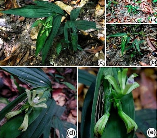 | Palmorchis triquilhada Ferreira Filho & Barberena sp. nov. (a)–(c) habit; (d)–(e) flowers. |