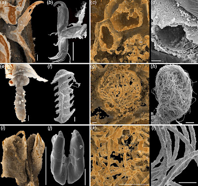| Figure 4. Preserved body parts in fossils in comparison with modern analogues. Body parts of Myanmarcypris hui gen. et sp. nov. were visualized by tomography and volume rendering of female (BA19005-2) and male (BA19005-1) adult individuals, modern analogues by scanning electron microscopy. (a) Right 5th limb of male with clasping organ (top). (b) Eucypris virens: right 5th limb of male with clasping organ (top). (c) Two eggs in female partly cut open. (d) E. virens: empty egg shell. (e) Zenker organ. (f ) Cyclocypris ovum: Zenker organ. (g) Mass of sperms in location of seminal receptacle in female. (h) Mytilocypris mytiloides: densely packed sperm filling of a seminal receptacle. (i) Paired hemipenes. (j) Fabaeformiscandona subacuta: paired hemipenes. (k) Sperms in female. (l) Pseudocandona marchica: sperms in female.