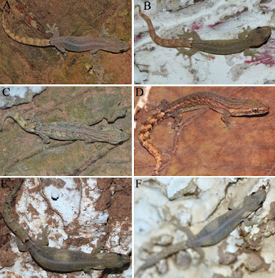 | Figure 6. Colour variation in Hemiphyllodactylus minimus sp. nov. (A & B) males and (C, D, E, F) females, all from the type locality (uncollected individuals).