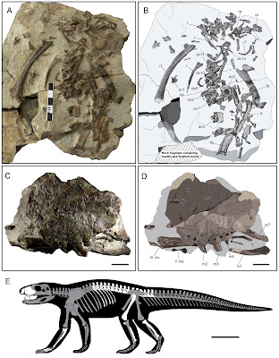 | Figure 1: Skeletal remains of of Ogresuchus furatus (MCD-7149). (A,C) Photographic and (B,D) interpretative draws of the postcranial (A,B) and cranial (C,D) elements, and (E) silhouette showing preserved elements of Ogresuchus furatus.