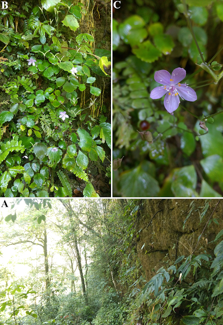 Habitat and ecology. The new species grows in disturbed primary evergreen forest on a limestone mountain at elevations of 1297 m, as a lithophytic herb on large wet mossy boulders and cliffs on steep slopes (Fig. 4).
