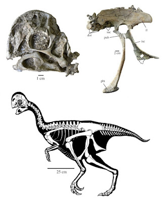Diagnosis. Oksoko avarsan is a small oviraptorid oviraptorosaur distinguished from other oviraptorosaurs by the following suite of autapomorphies (*) and other characters: apically thickened, dome-shaped cranial crest composed equally of nasals and frontals (figure 2)*; nasal recesses housed in a depression; postorbital with dorsally directed frontal process; cervical vertebrae with large epipophyses; functionally didactyl manus (figure 3)*; accessory ridge of brevis fossa of ilium*; anteriorly curving pubis; and large proximodorsal process of distal tarsal IV.
