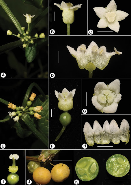 | Figure 4. Photographs showing reproductive characters of Zehneria grandibracteata A male inflorescence B male flower, side view C male flower, top view D dissected male flower showing disc and stamens E female inflorescence F female flower, side view G female flower, top view H dissected female flower showing staminodes I pistil and disc J infructescence K cross-section of fruit.