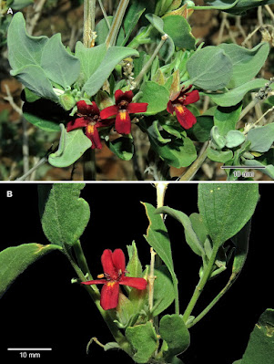 | Figure 1. Petalidium kaokoense Swanepoel. A. Flowers and leaves; greyish leaves are still densely covered in trichomes. B. Flowering shoot; leaves almost glabrous.