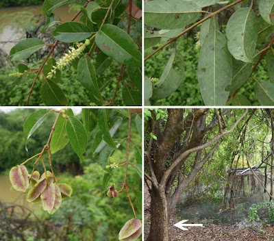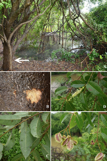 | Figure 2. Terminalia santisukiana Patthar. & Poopath: A. habitat, the tree is the largest trunk (arrow); B. bark; C. lower surface of glaucous leaves; D. inflorescences; E. infructescences.