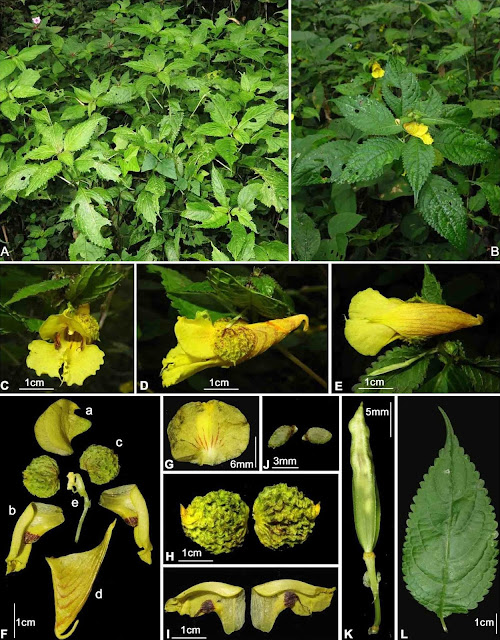 | Fig. 2. Impatiens plicatisepala C. Y. Zou, Yan Liu & S. X. Yu A. Habitat, B. Habit, C. Flower, front view, D. Flower, lateral view, E. Flower, bottom view, F. Dissected floral parts, a. dorsal petal, b. lateral united petals, c. lateral sepals, d. lower sepal, e. stamens, G. Dorsal petal, adaxial view, H. Lateral sepals, I. Lateral united petals, J. Seeds, K. Capsule, L. Leaf. |