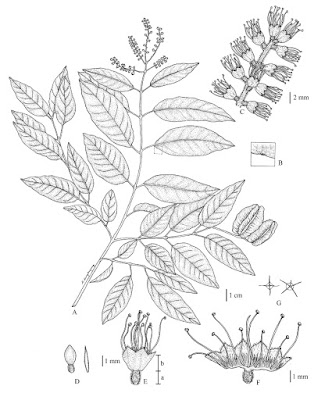 | Figure 1. Terminalia santisukiana Patthar. & Poopath: A. habit; B. gland on margin near base (×20); C. inflorescence; D. flower bud and bract; E. flower, side view (a. lower receptacle, b. upper receptacle); F. dissected flower; G. 4- and 5-winged fruits, top view.