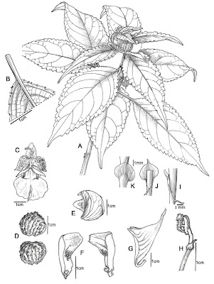 | Fig. 1. Impatiens plicatisepala C.Y. Zou, Yan Liu & S.X. Yu A. Flower branch, B. Leaf base dorsal view with stipitate glands, C. Flower, front view, D. Lateral sepals, E. Dorsal petal, lateral view, F. Lateral united petals, G. Lower sepal, lateral view, H. Stamens and pistils. I. Bracts, lateral view, J. Bracts, front view, K. Bracts, dorsal view. |
