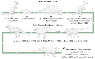 | “Evolution” of the restorations of Parasaurolophus through history, starting from top left. The drawings of each “morphology” represent the general overview of the taxon as understood at that time, together with the external features usually depicted. (a) Knight‐influenced: tripodal stance, lizard like anatomy with a large neck frill; (b) crest used as muscular attachment; (c) the aquatic Parasaurolophus: the crest is reconstructed as functionally related to aquatic behavior (e.g. air store, water trap or snorkel) for feeding on soft sub‐aqueous vegetation; (d) Pre‐Dinosaur Renaissance influence: tripodal stance, bulkier anatomy, usually terrestrial, but aquatic depictions still prosper; (e) Post‐Dinosaur Renaissance influence: skeletal proportions and overall posture more consistently correct, overly pronated forelimbs, slender anatomy, neck frill and “saddle” variably present; (f) Contemporary reconstructions: bulkier anatomy, thicker neck increasingly common, correctly configured forelimbs and pectoral girdles increasingly common, neck frill and “saddle” generally absent, larger rhamphotheca, speculative soft tissue increasingly common. The years within brackets refer to the year of the published image by the illustrator |