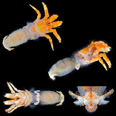 Diagnosis. Cephalothoracic shield width not exceeding length; rostrum well developed, angular, produced anteriorly beyond blunt anterolateral projections; narrow flattened frontal rim continuous across front between anterolateral projections, crossing rostrum without disjuncture; dorsal surface with angular depression on either side of shield posterior to rim behind each ocular peduncle. Median calcified plate of cardiac region subrectangular, slightly longer than wide. Ocular acicles armed with 2 spinules distally. Antennal acicle extending anteriorly less than onehalf length of ocular peduncle. Cheliped and second pereopod distal segments adapted to form operculum when withdrawn into habitat opening, outer surfaces of carpus and propodus with concave opercular depression. Cheliped propodus (palm) with opercular depression limited mesially by crest of 7 or 8 marginally denticulate lobes. Second pereopod propodus with opercular depression limited laterally by crest of 5 marginally denticulate lobes. Pleon elongate, with lightly sclerotized transverse tergites dorsally, 4 minute biramous pleopods on left side, depressed longitudinal groove along left side; sixth pleonite greatest width exceeding three-fourths greatest length, anterior lobes to either side of median incision each armed by 7 or 8 strong spines. Uropods and telson symmetrical; telson subovoid, anteriorly with subtriangular median dorsal prominence, posterior margin entire, unarmed except for setae. Color pattern of orange to yellow-orange dominating most dorsal surfaces and superior surfaces of anterior appendages, darker blotches and spots of deeper orange to reddish brown. A diagnostic COI gene sequence available under GenBank accession number MT800937.