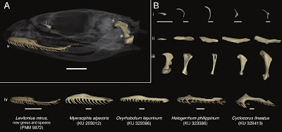 | Fig. 4 Comparison of selected cranial bones of cyclocorid species. (A) Skull of Levitonius mirus, new genus and species, showing the position of bones i–iv; from left to right: bones of L. mirus, new genus and species, Myersophis alpestris, Oxyrhabdium leporinum, Hologerrhum philippinum, and Cyclocorus lineatus; i = postorbital bone, ii = supratemporal bone, iii = quadrate bone, and iv = maxilla. White scale bars = 1 mm. |