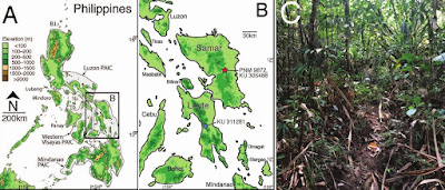 | Fig. 1 (A) Elevation map of the Philippines, showing location of islands and PAICs mentioned in this article; B.I. = Babuyan Island Group, Sb. = Sibuyan Island, Sq. = Siquijor Island, C.S. = Camiguin Sur, Tb. = Tablas. (B) Samar, Leyte, and nearby islands; red star indicates the type locality of Levitonius mirus, new genus and species; blue circle indicates a second occurrence locality; (C) karst rainforest habitat at the L. mirus, new genus and species, type locality (Barangay San Rafael, Municipality of Taft, Samar Island). |