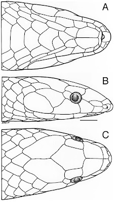 | Fig. 8 Head scalation of Levitonius mirus, new genus and species, holotype (PNM 9872); (A) ventral, (B) lateral, and (C) dorsal views of head.