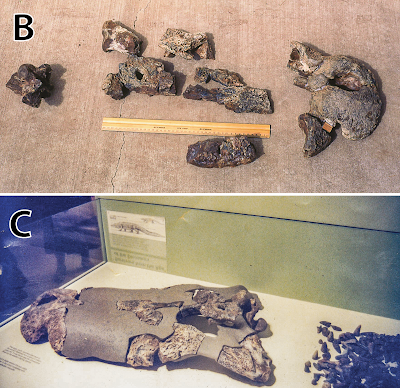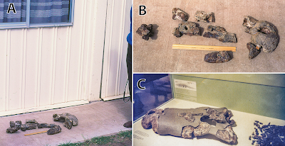 | Figure 8: Paludirex vincenti gen. et sp. nov., ‘Geoff Vincent’s specimen’ (CMC2019-010 + QMF59017), holotype—specimen background. (A) and (B) ‘Geoff Vincent’s specimen’ as photographed at Mr. Vincent’s house, and (C) the specimen as photographed on display at the Queensland Museum sometime in the 1990s. Several pieces are missing in B (also in A, albeit less apparent), specifically, the posterior portion of the left maxilla (from CMC2019-010-4); the cranial table unit (CMC2019-010-5) is missing its right half; and, the quadratojugal & posterior jugal process unit (CMC2019-010-7). The reason why these pieces are not in the photographs is unknown, as they are obviously present in (C) when the specimen was publicly displayed. Also notice a small unidentified piece glued posteriorly to the lacrimal (B) that is not depicted in the display mount (C) and could not be located with the specimen as examined for the purposes of this study. Photographs in (A) and (B) taken August 1988 by Ralph E. Molnar; photograph in (C) property of the Chinchilla Museum, used with permission. |
