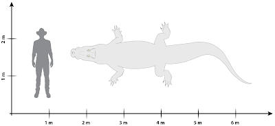 | Figure 39: Hypothetical size reconstruction silhouette of Paludirex vincenti gen. et sp. nov. The skull shape reconstruction is based on the Paludirex vincenti holotype (‘Geoff Vincent’s specimen’ CMC2019-010 + QMF59017). The hypothetical body outline and proportions of Paludirex vincenti are based on those of extant crocodylians. The osteoderms are intentionally not depicted since the osteoderm configuration is currently unknown for Paludirex vincenti. The human (dark gray silhouette on the left) is 1.80 m tall. |