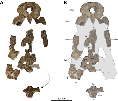 Abbreviations: bo, basioccipital; bs, basisphenoid; fro, frontal; jug, jugal; lac, lacrimal; max, maxilla; nas, nasals; oto, otoccipital; par, parietal; pmx, premaxilla; po, postorbital; prf, prefrontal; q, quadrate; qj, quadratojugal; sq, squamosal. |