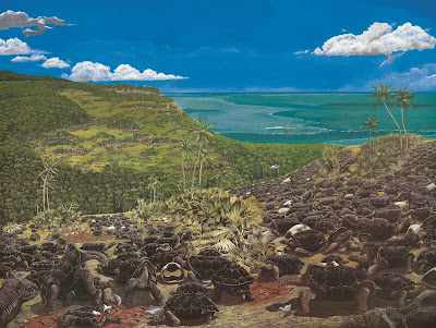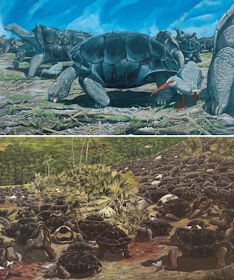 | Two species of extinct giant tortoises, Cylindraspis vosmaeri (larger, saddlebacked) and C. peltastes (smaller, domed) in their native habitat on Rodrigues Island in the late 1600s when accounts indicate the herds of tortoises were so large and dense that it was possible to walk for long distances on their backs without touching the ground (Leguat 1707).