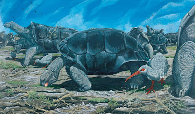 | Rodrigues giant tortoises on the Plaine Corail, based on a unique stuffed Saddleback Tortoise Cylindraspis vosmaeri male (MNHN 1883.558; centre left) and a complete carapace of Domed Tortoise C. peltastes (MNHN 7831; front). The Rodrigues rail Erythromachus leguati, a predator of tortoise eggs and young, forages amongst the tortoises. in Hume, Griffiths, ... et Bour, 2021. Illustration: Julian Pender Hume |