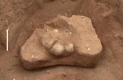 | A complete clutch of Cylindraspis vosmaeri eggs removed intact from PB4 on Rodrigues Island. The clutch contains 13 eggs.